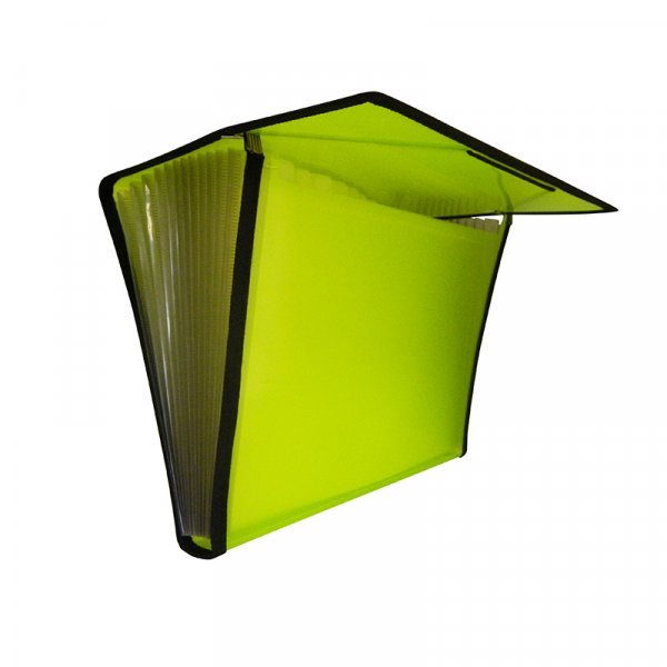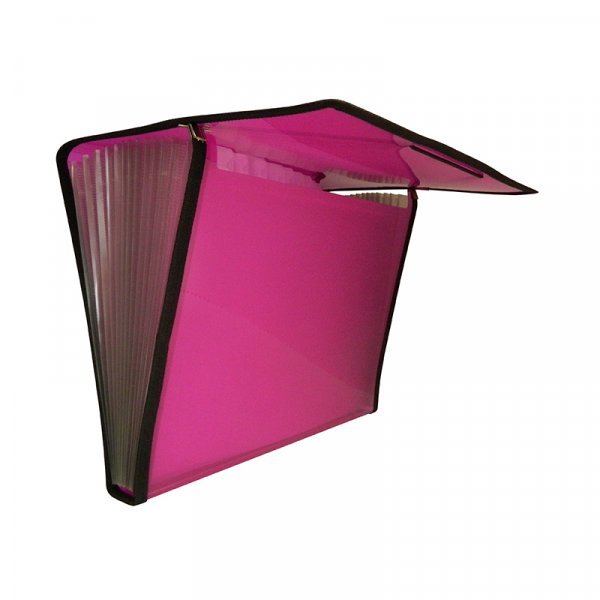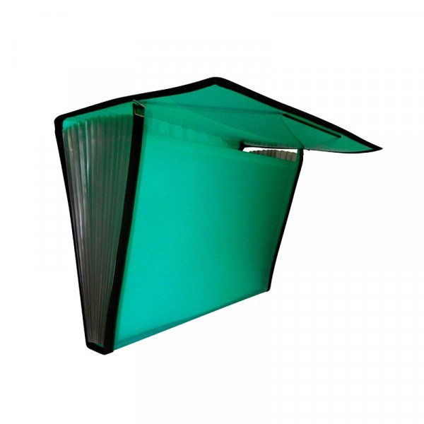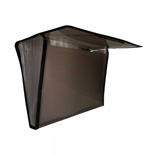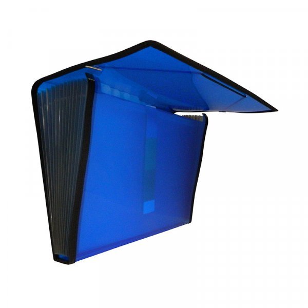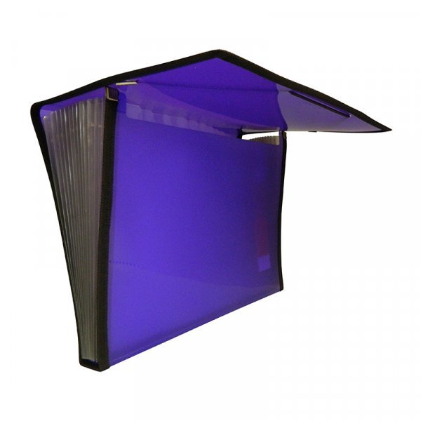 Carpeta clasificadora en polipropileno translúcido con 12 separadores transparentes y expandibles. Etiquetas intercambiables para documentos en cada separación. Cierre con elásticos y ribetes de tela.