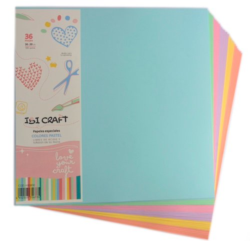 Pack con 36 hojas de papeles especiales IBI CRAFT libres de ácido y teñidos en su pasta, en formato de 30X30 cms y 180 grs. Papel de alta calidad, combinados en 6 colores pastel ideales para creaciones de scrapbooking, proyectos de layout, manualidades, etc.