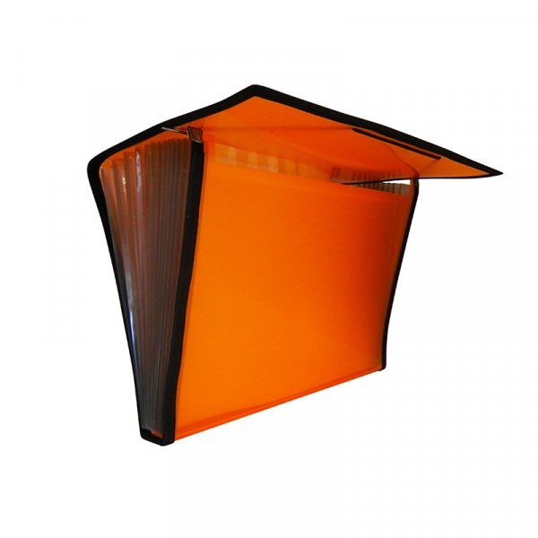 Carpeta clasificadora en polipropileno translúcido con 12 separadores transparentes y expandibles. Etiquetas intercambiables para documentos en cada separación. Cierre con elásticos y ribetes de tela.