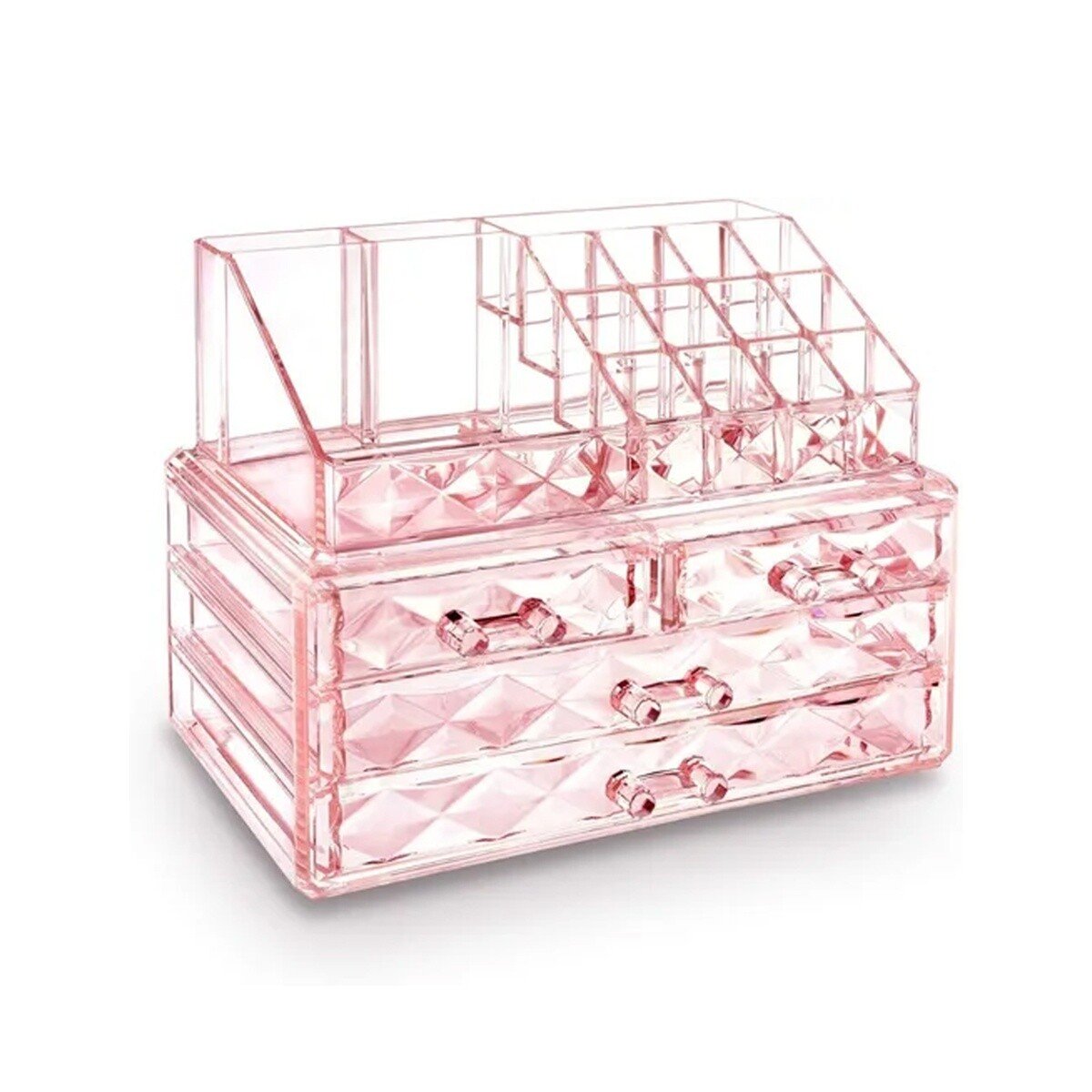 Organizador de escritorio IBI CRAFT con cajonera doble y bandeja compartimentada desmontable. Fabricado en acrílico rosa con diseño cristal de diamante. Dimensiones: (Ancho = 24 cms.), (Alto = 18,5 cms.), (Prof. = 15 cms).